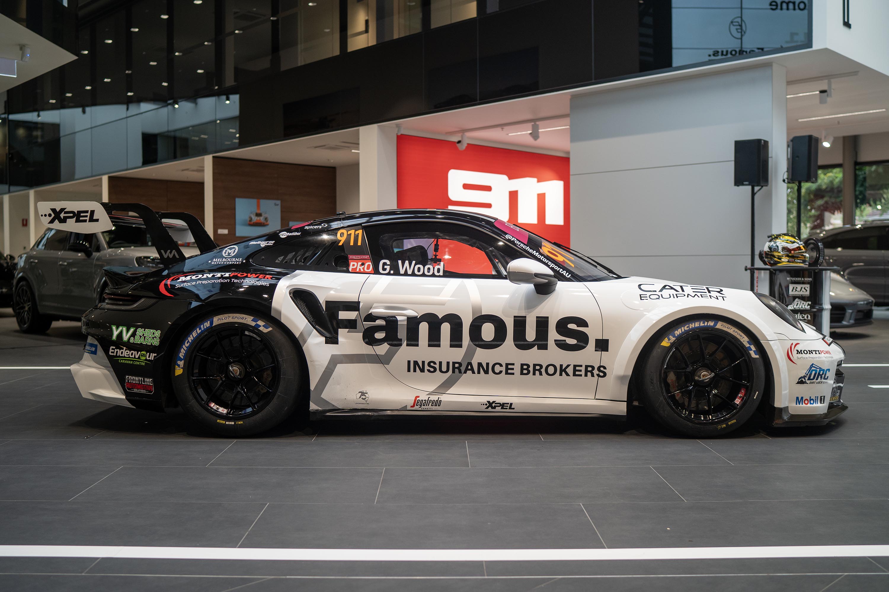 The entryโs striking new livery made a spectacular public debut at Porsche Centre Melbourne on Monday 2 March, pulling the wraps off a mostly-white composition featuring prominent Famous Insurance branding.