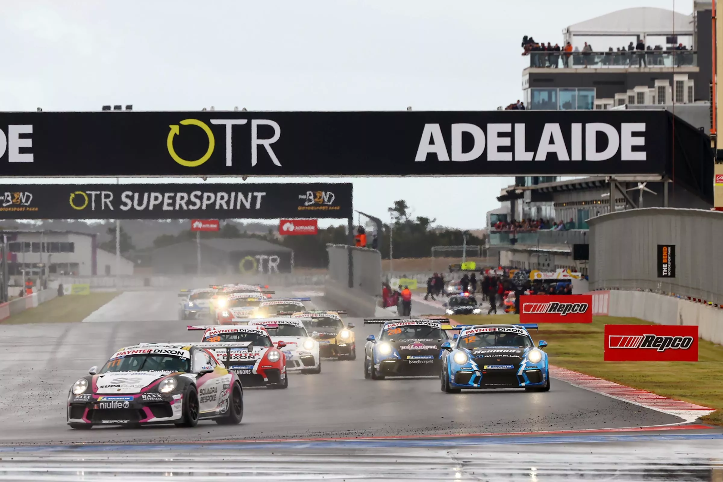 Porsche Paynter Dixon Carrera Cup Australia series leader Cameron Hill has survived rain and chaos to win the opening race of round two at The Bend Motorsport Park in South Australia.ย